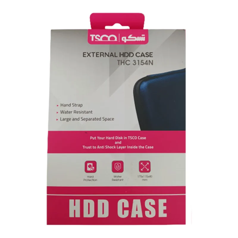 کیف هارد THC 1354محصول برند ایرانی تسکو است. این کیف برای محافظت از هاردهای اکسترنال در برابر ضربه ساخته شده است و جنس سخت قسمت بیرونی آن، بهخوبی از پس این کار برمیآید. در قسمت داخلی کیف، یک سمت با توری پارچهای پوشانده شده که محل قرارگیری هارد است و یک قسمت کشی در سمت دیگر برای قرارگیری کابل اتصال هارد در نظر گرفته شده است. رنگبندی متنوع و جنس برزنتی خوب، از مشخصات اصلی این محصول است.